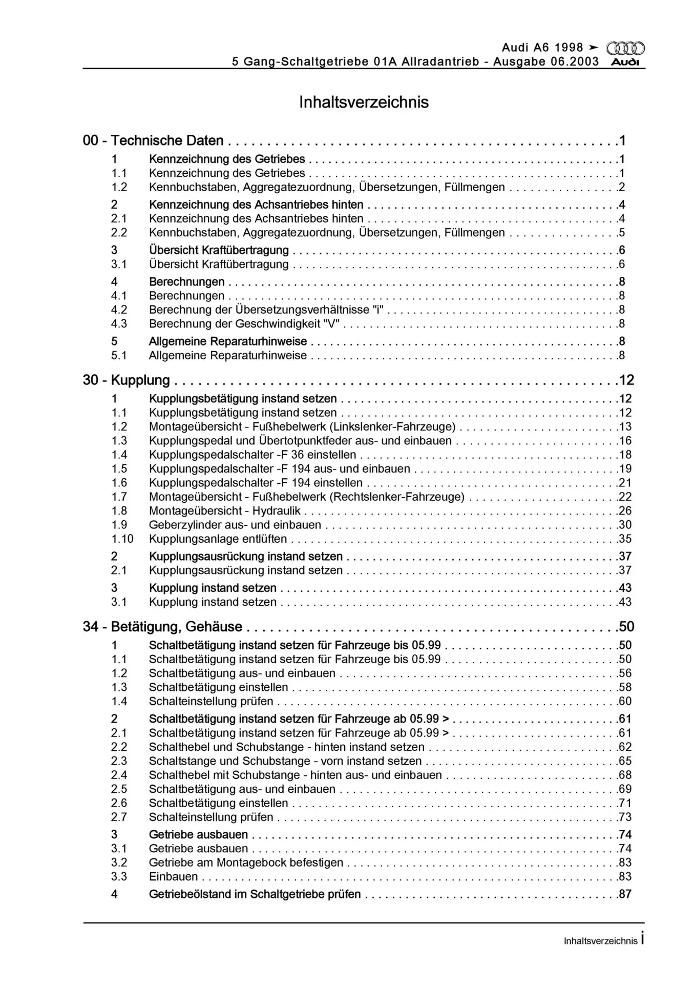 Audi A6 Typ 4B 1997-2005 5 Gang Schaltgetriebe 01A Kupplung Reparaturanleitung