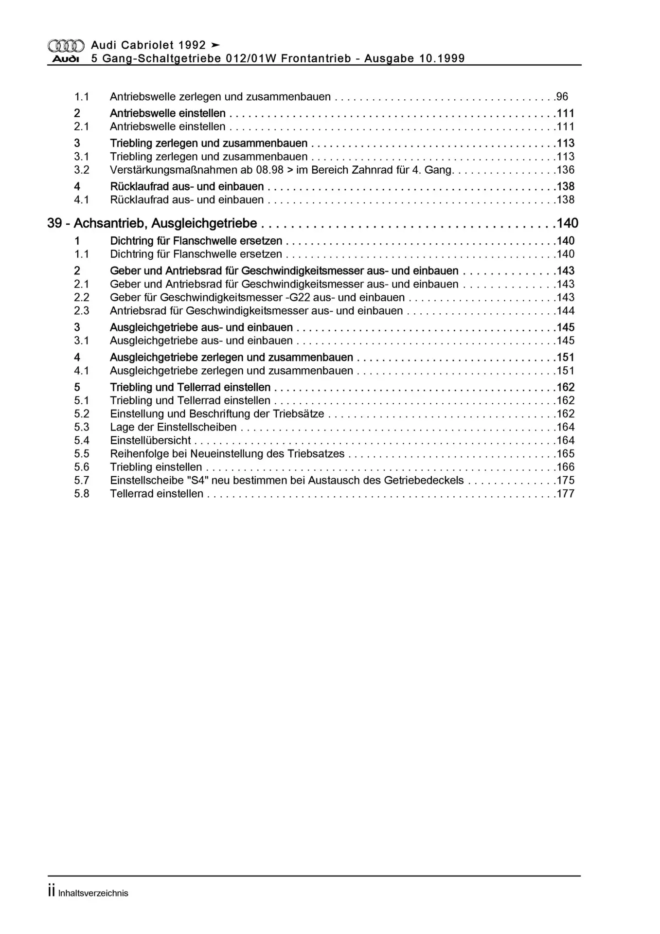 Audi Cabriolet 1991-2000 5 Gang Schaltgetriebe 012/01W FWD Reparaturanleitung