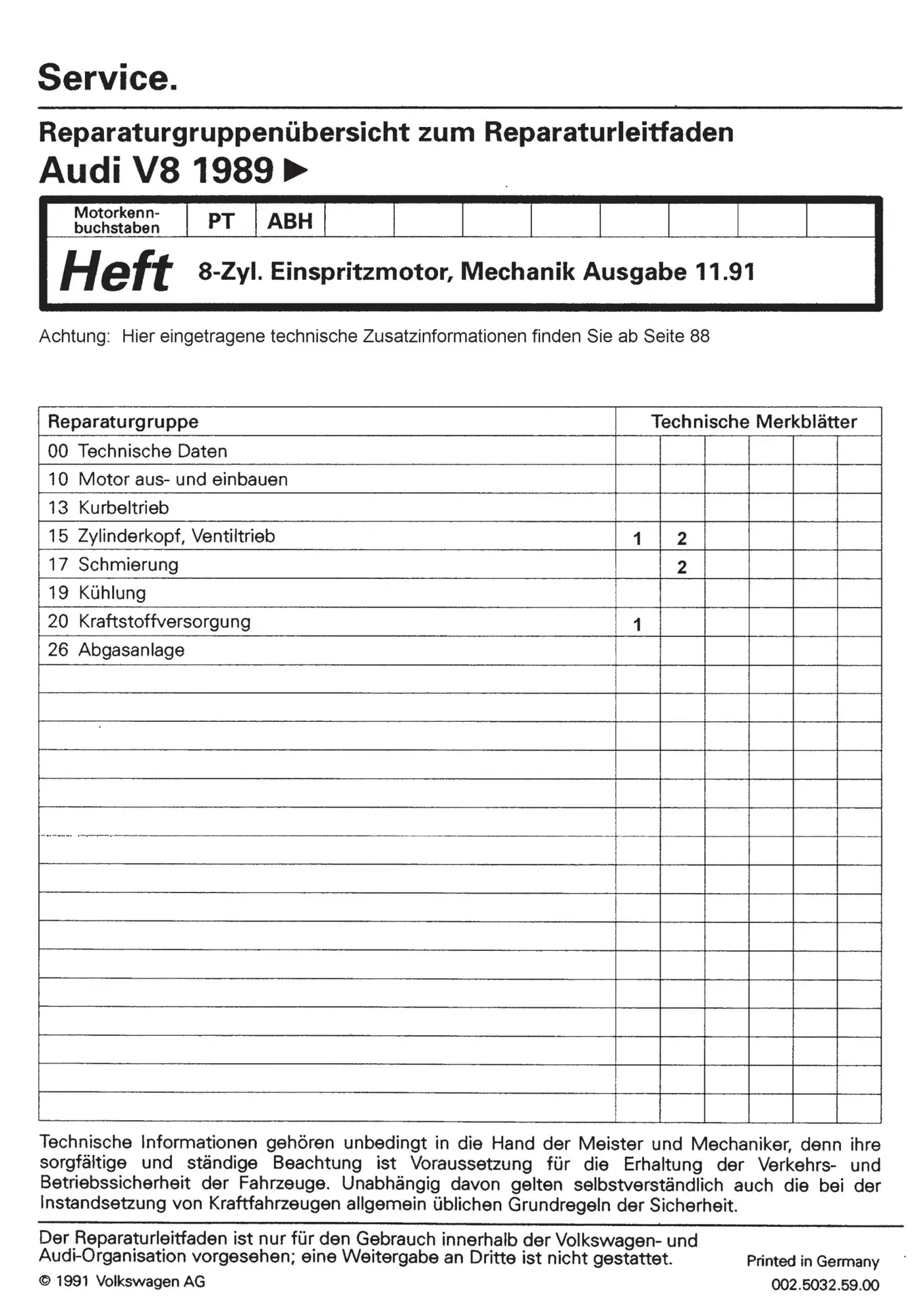 Der Audi V8 Reparaturleitfaden ist ein lizenzierter Nachdruck der originalen Werkstattunterlagen. Diese Anleitung wird von Vertragswerkstätten verwendet und enthält alle technischen Informationen für fachgerechte Reparaturen.