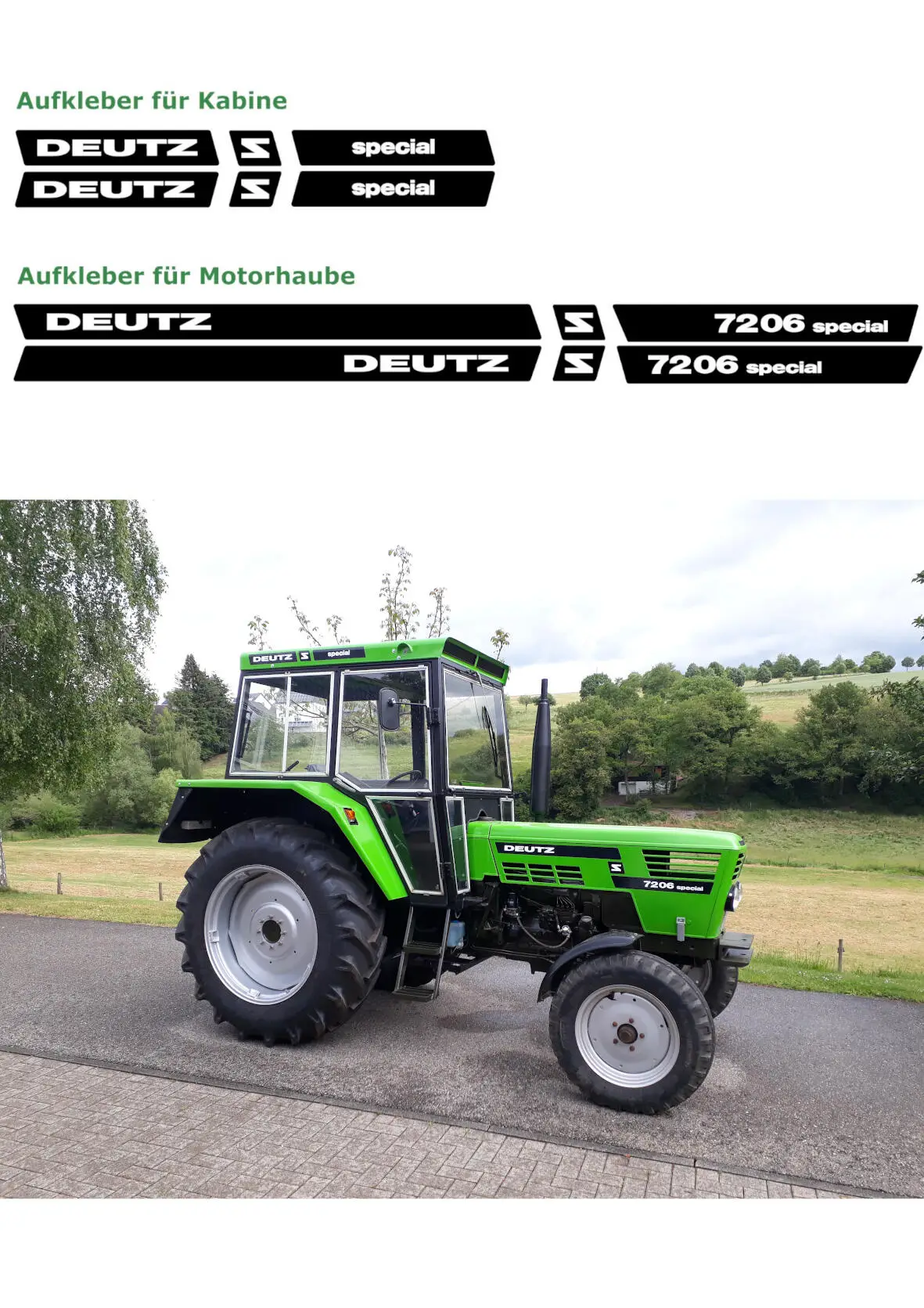 | Umfang | Aufklebersatz Kabine (links/rechts): 2x „Deutz“, 2x S-Symbol, 2x „special“; Aufklebersatz Motorhaube (links/rechts): 2x „Deutz“, 2x S-Symbol, 2x „7206 special“; Varianten: Kabine Silber, Kabine Weiß, Motorhaube Silber, Motorhaube Weiß, Set komplett Silber, Set komplett Weiß |