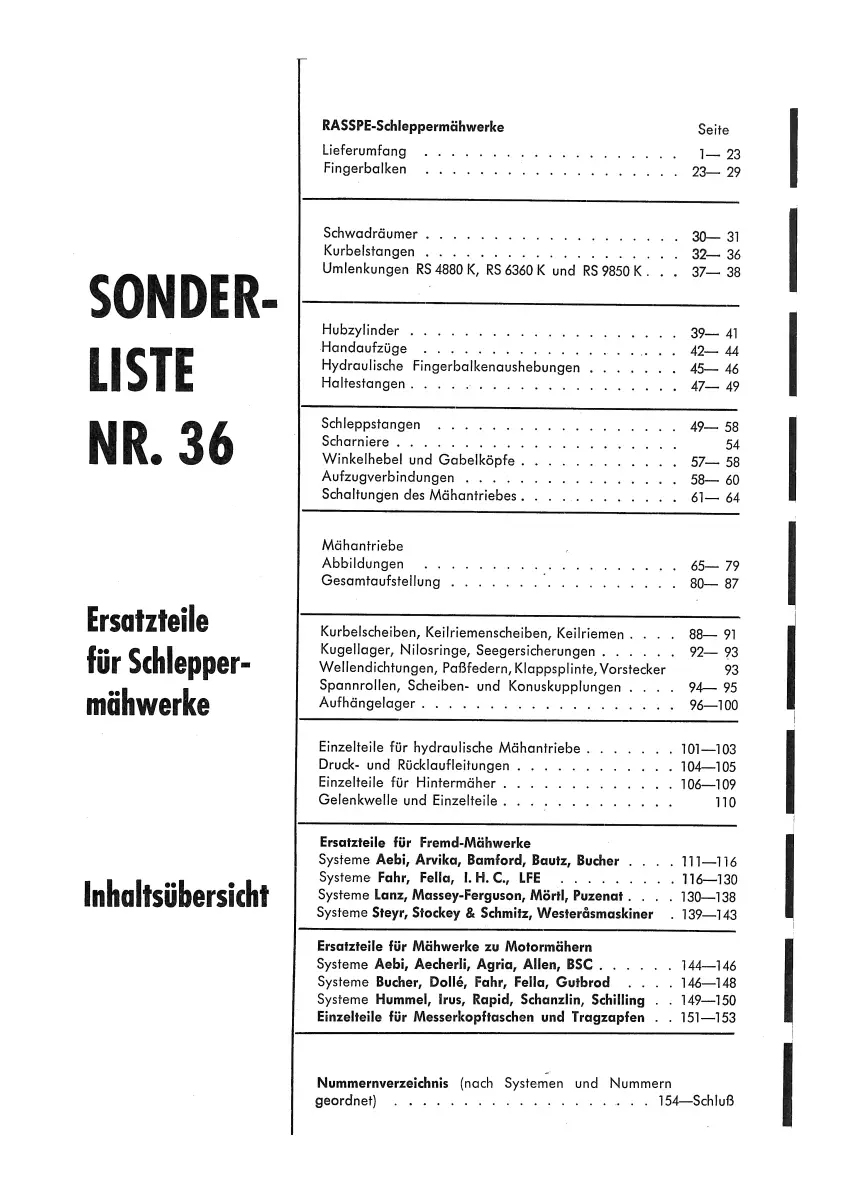 Rasspe Sonderliste Nr. 36 | Schlepper-Mähwerke | Explosionszeichnungen & Teileindex