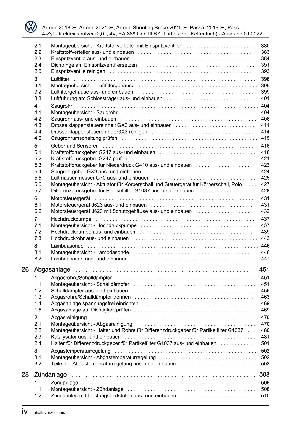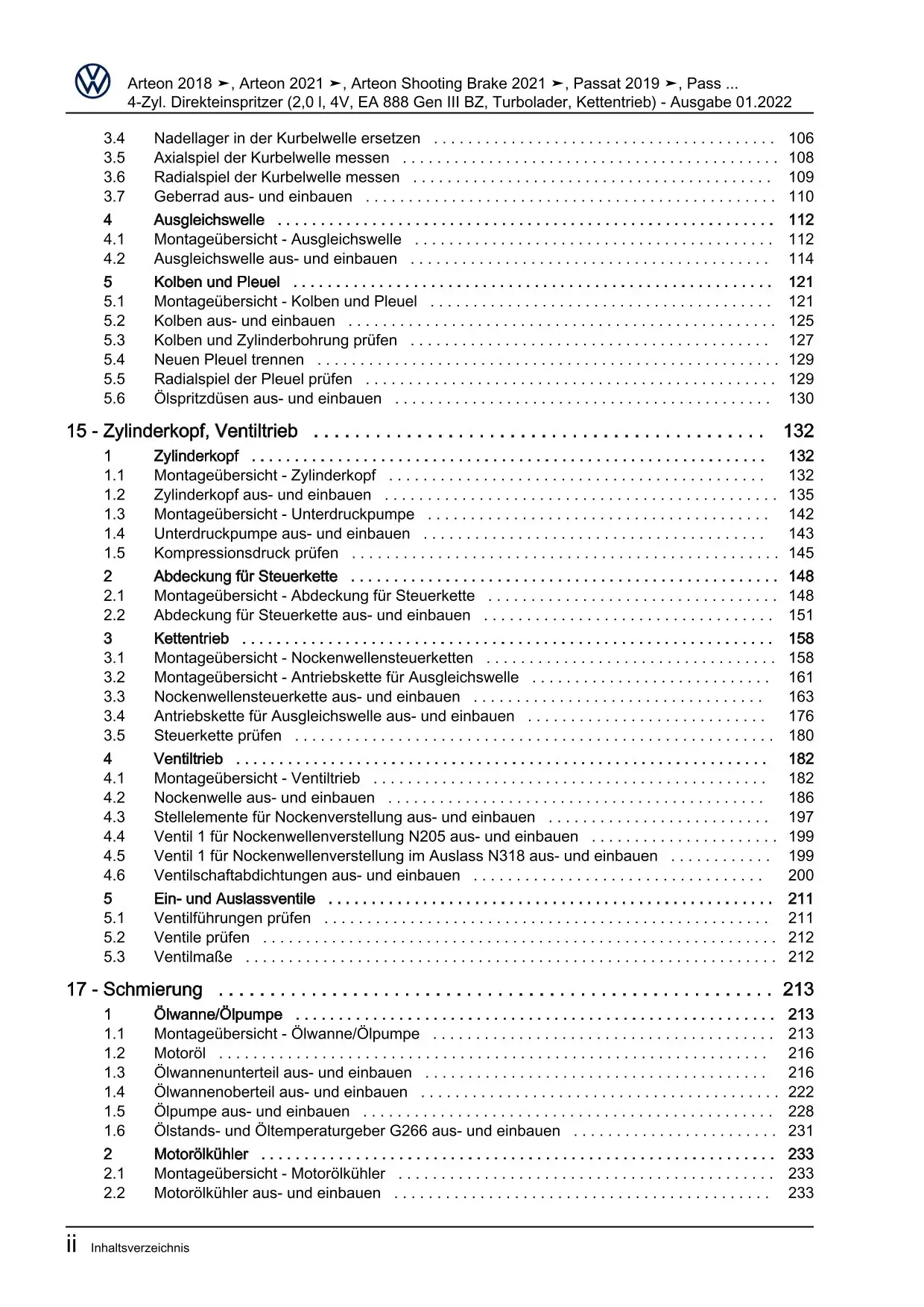 VW Arteon Typ 3H 2017-2020 4-Zyl. Benzinmotor 2,0l 180-200 PS Reparaturanleitung