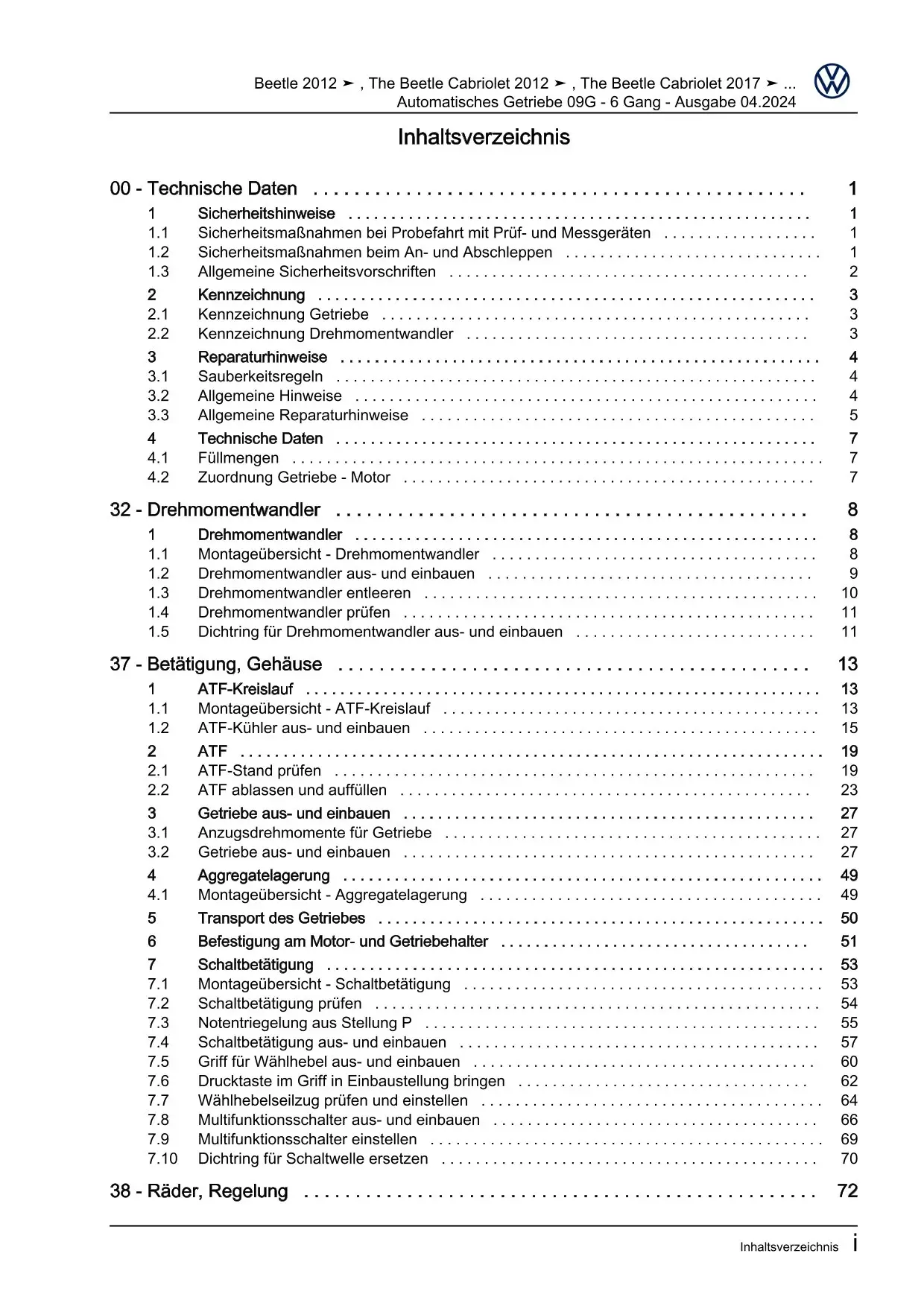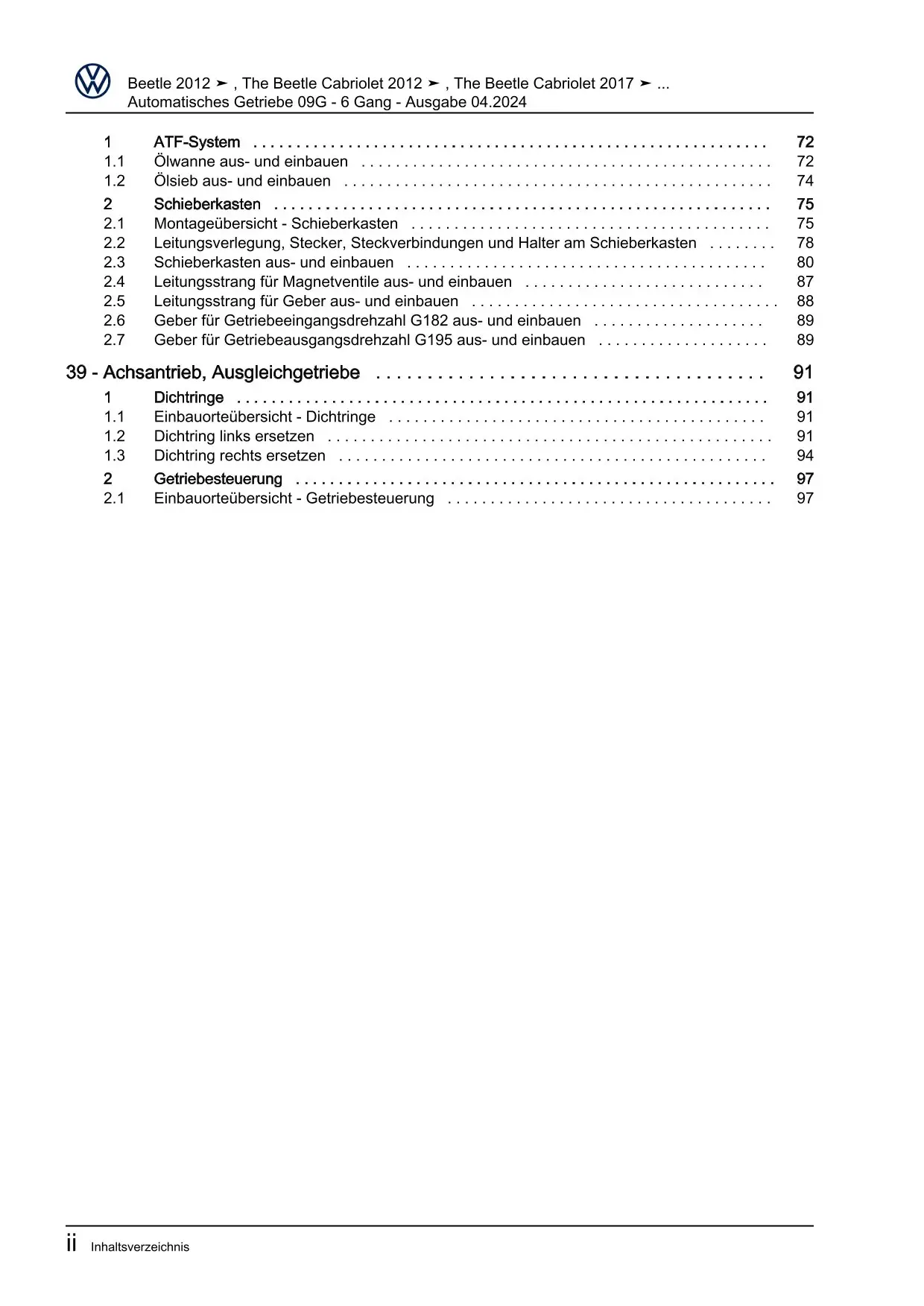 VW Beetle Typ NBL 2016-2019 6 Gang Automatikgetriebe 09G Reparaturanleitung