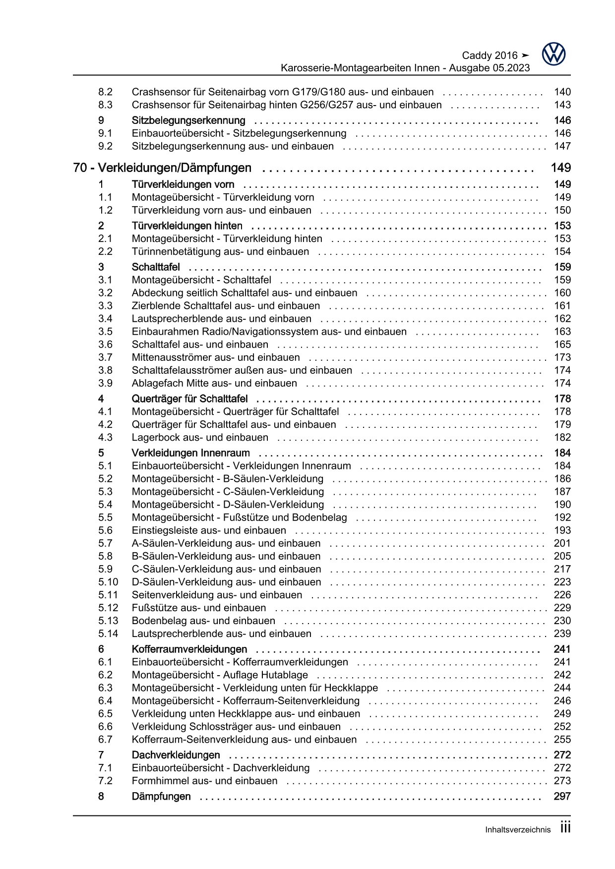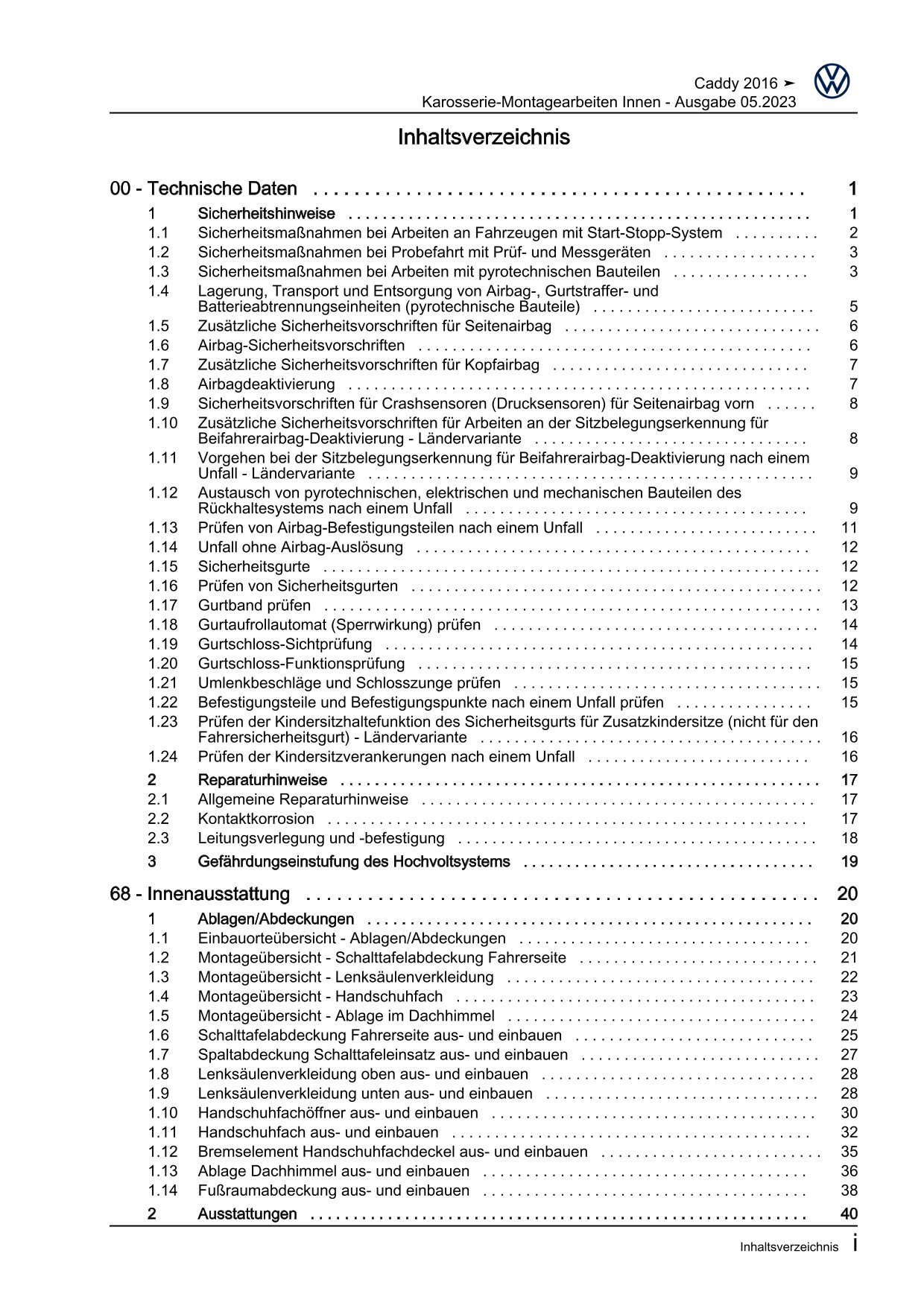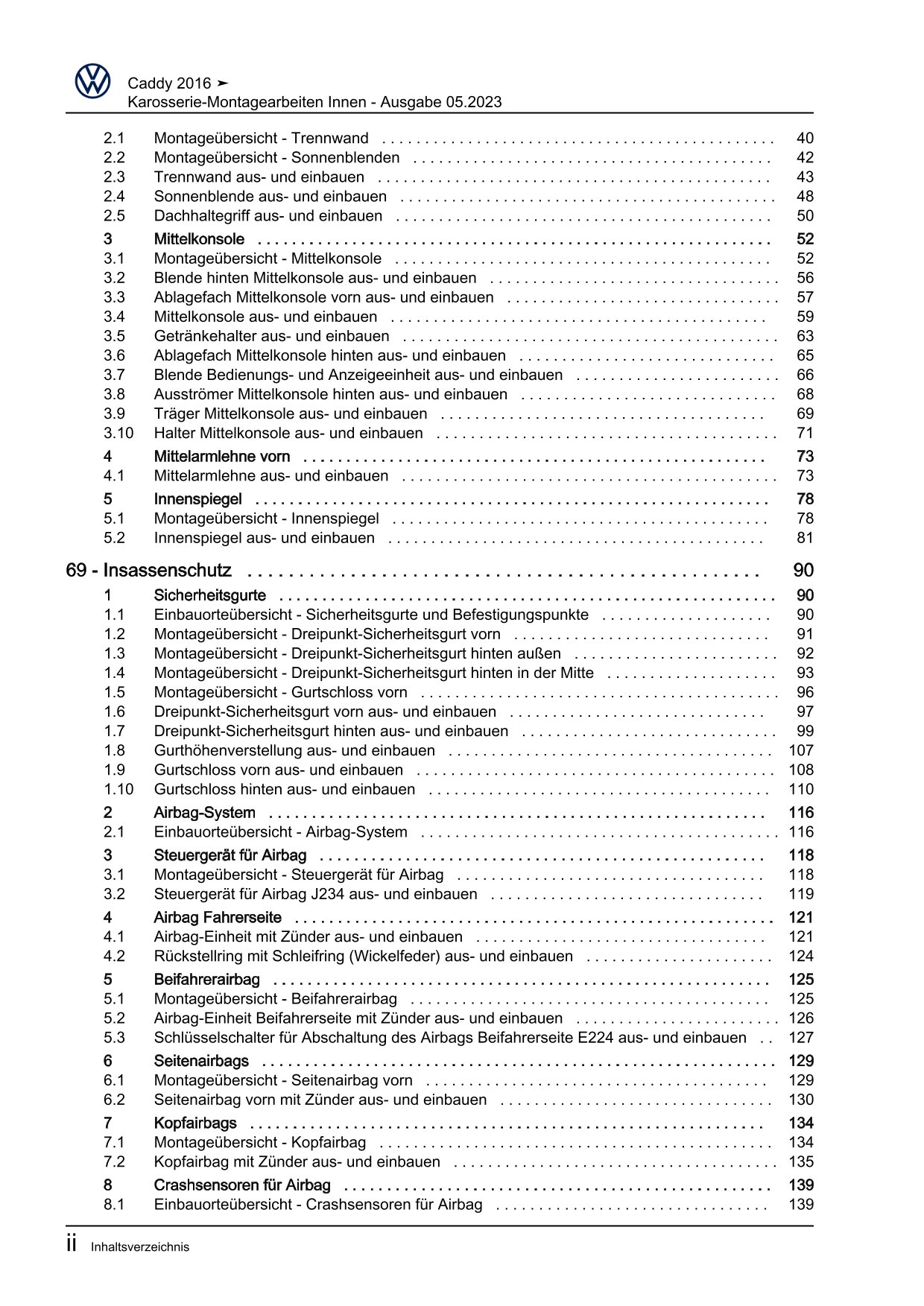 VW Caddy Typ SA 2015-2020 Karosserie Montagearbeiten Innen Reparaturanleitung