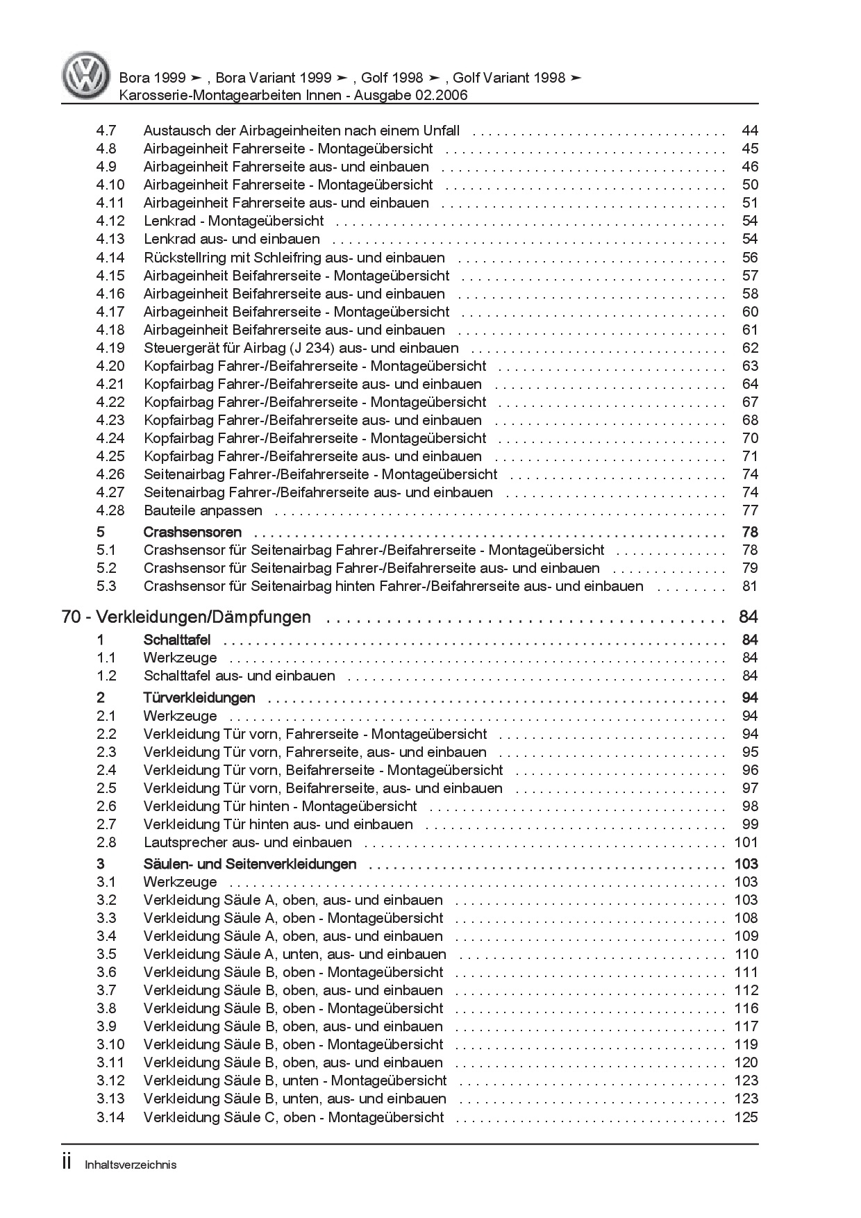Diese Reparaturanleitung enthält detaillierte Beschreibungen zu Aus- und Einbauarbeiten, Einstell- und Prüfarbeiten sowie zahlreiche Grafiken, Bilder und Explosionszeichnungen. Die Kunststoffringbindung ermöglicht ein problemloses Umschlagen bis zu 180°.