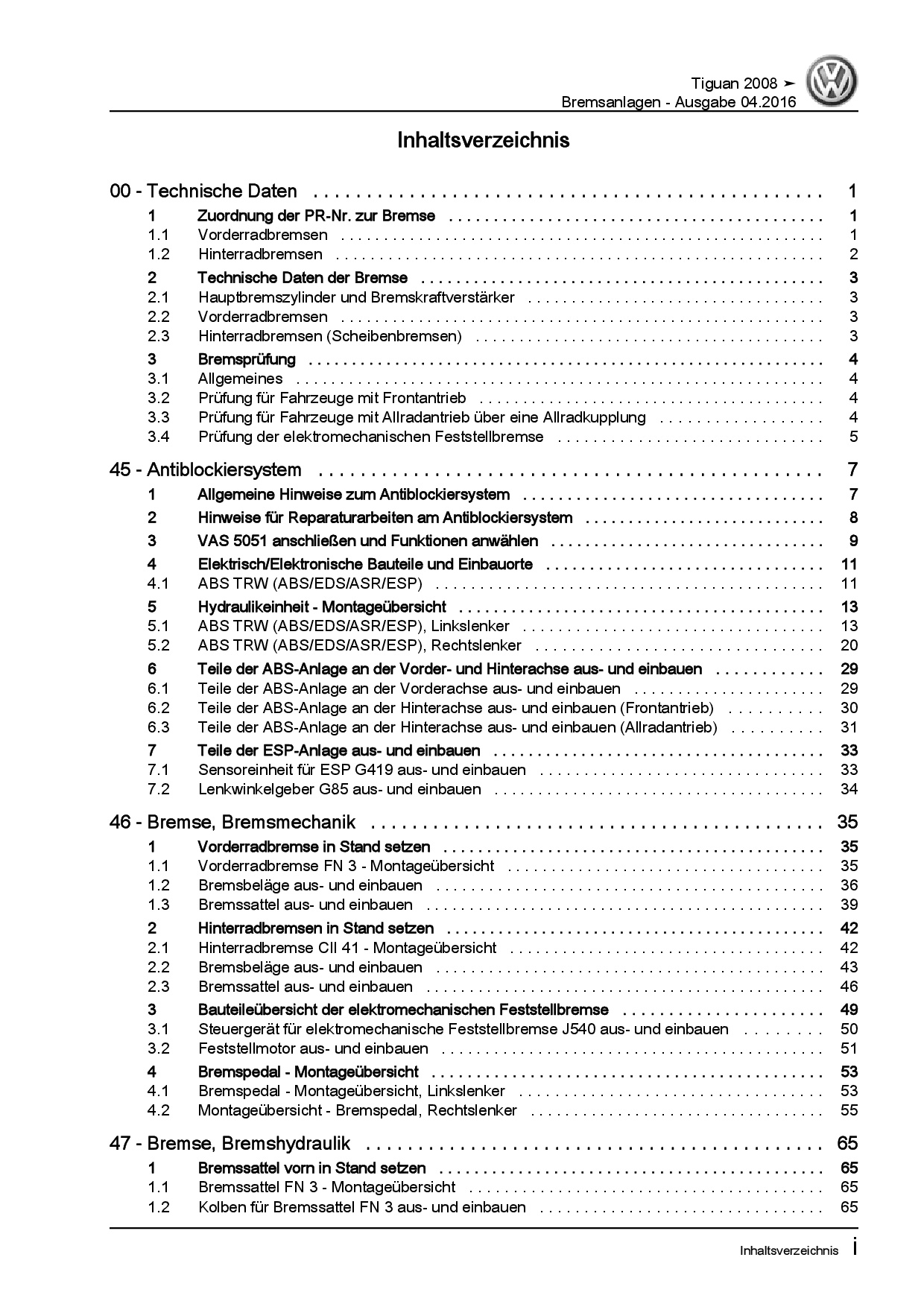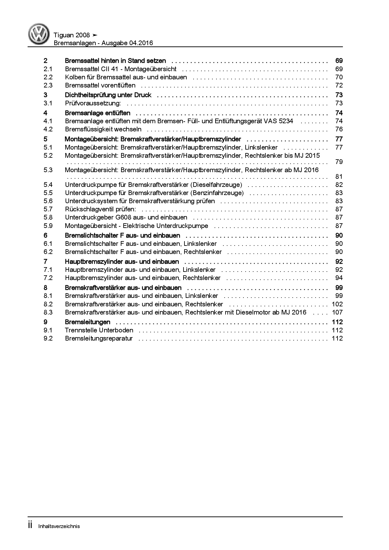 VW Tiguan Typ 5N 2007-2016 Bremsanlagen Bremsen System Reparaturanleitung