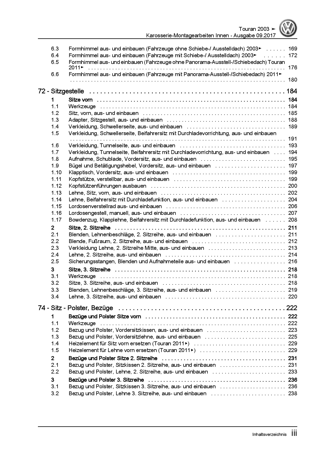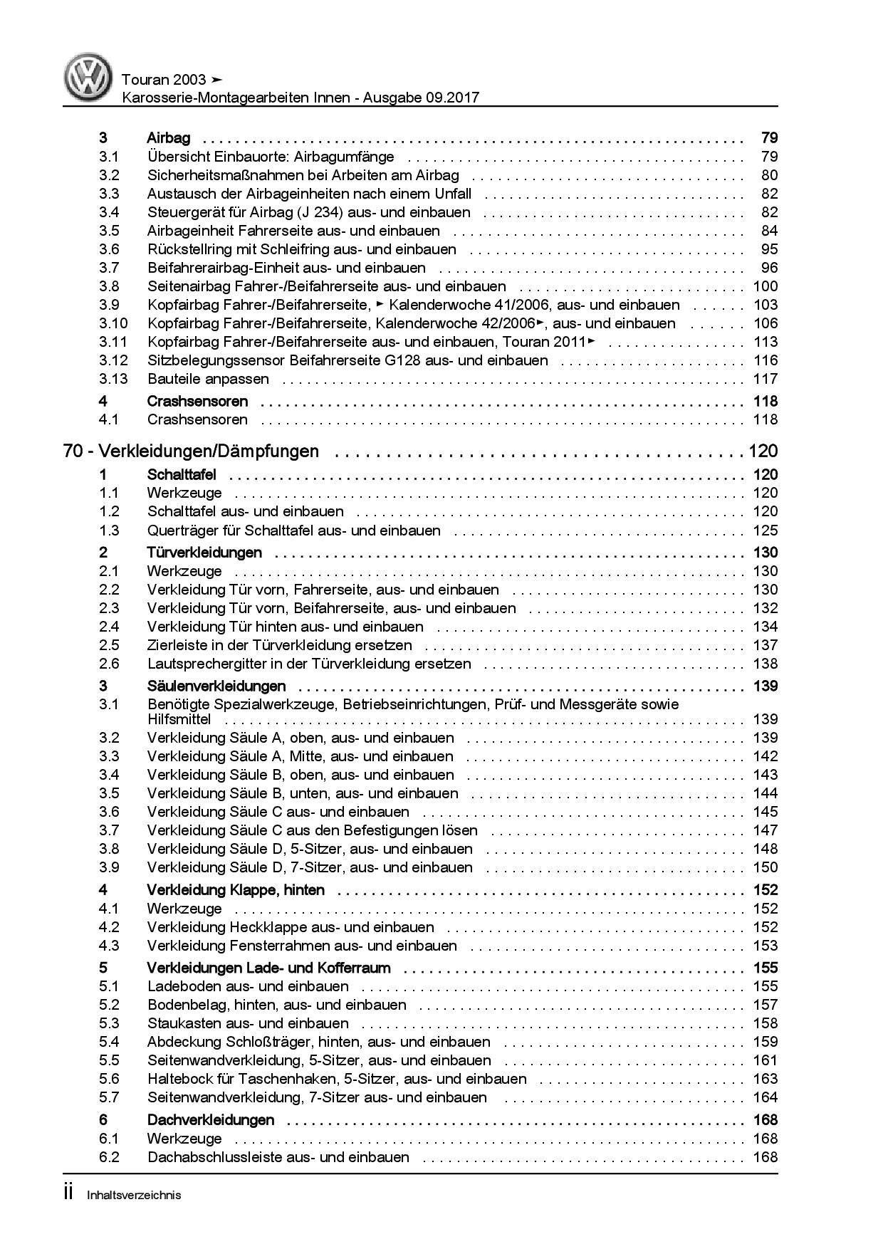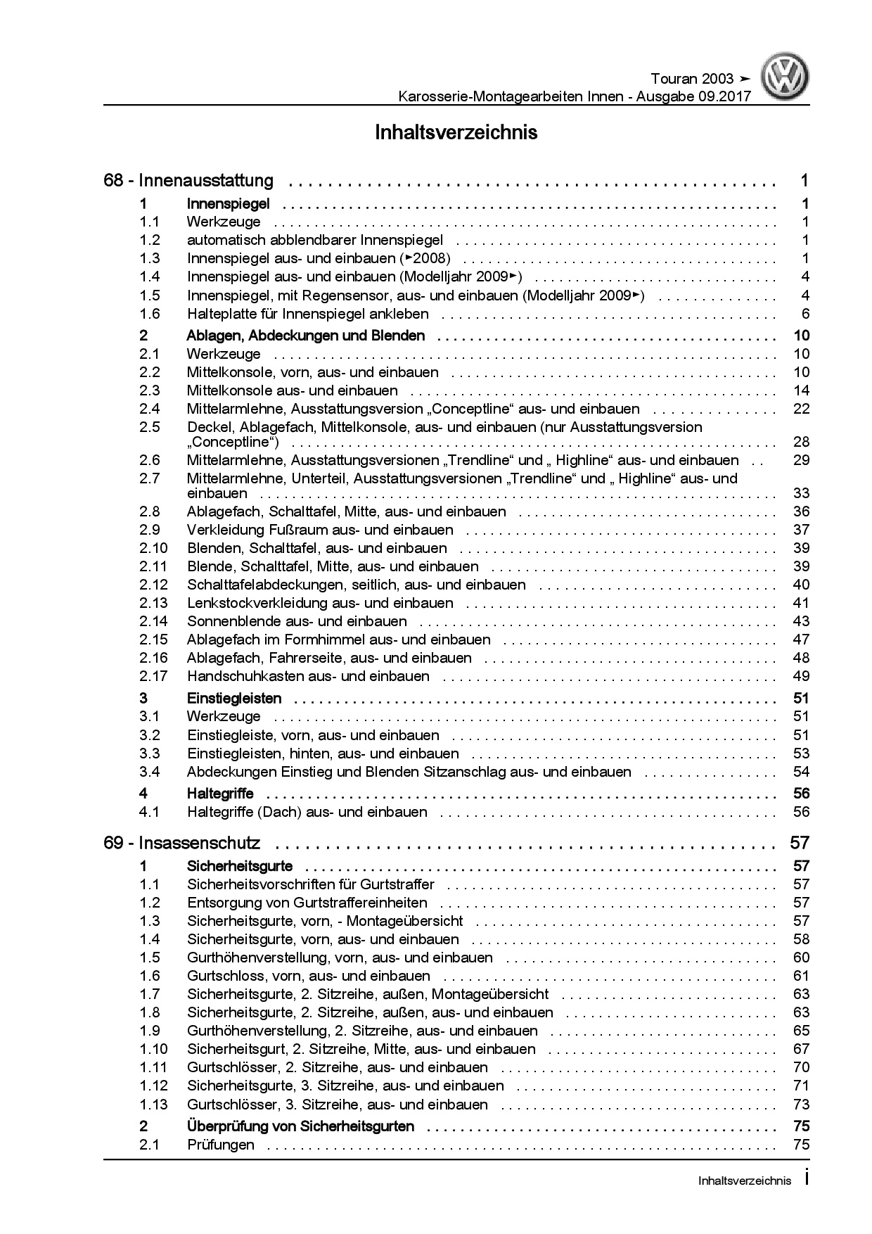 VW Touran Typ 1T 2003-2015 Karosserie Montagearbeiten Innen Reparaturanleitung